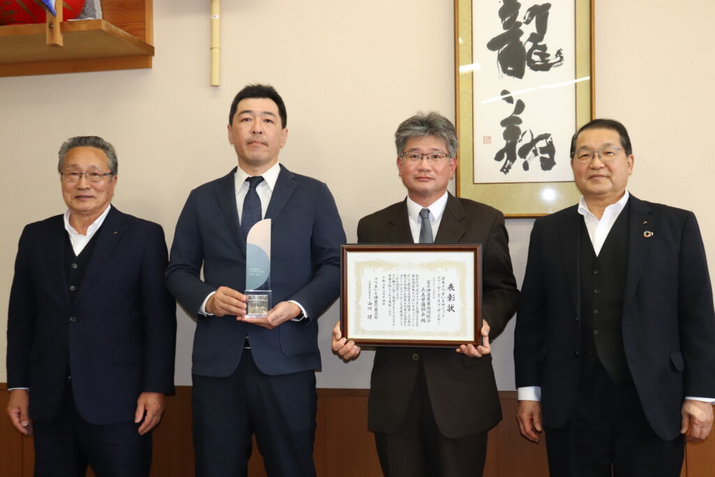 三島甘藷部会の平野光直部会長と遠藤信次副部会長が、受賞報告のため三島市長およびJAふじ伊豆組合長を訪問しました。市長は「市としても、引き続き応援していく」と話し、地域農業のさらなる発展に期待を寄せました。