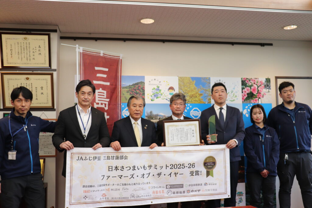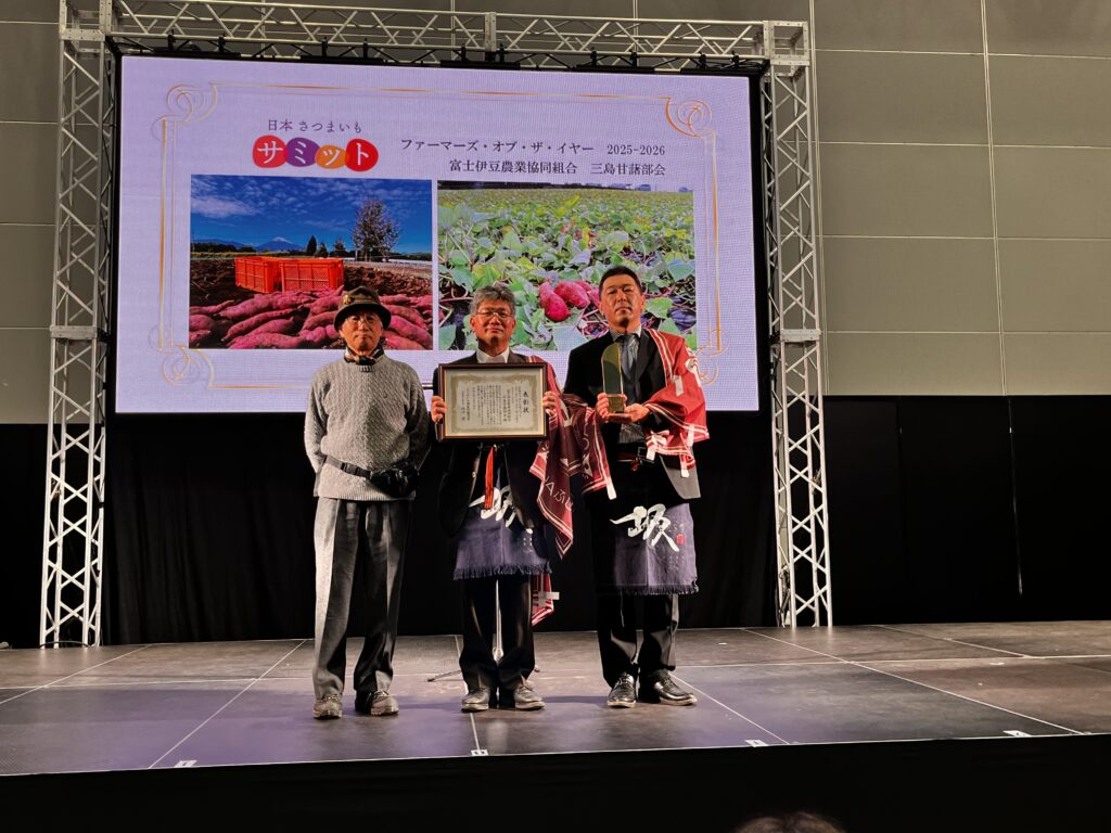三島甘藷部会が、「日本さつまいもサミット2025-2026」で、ファーマーズ・オブ・ザ・イヤーを受賞しました。このサミットは、全国の優れたサツマイモ生産者やブランド芋を表彰するもので、100以上の団体の中から受賞が決定しました。甘藷サポーター事業などの地域を巻き込んだ産地振興への取り組みが高く評価されました。