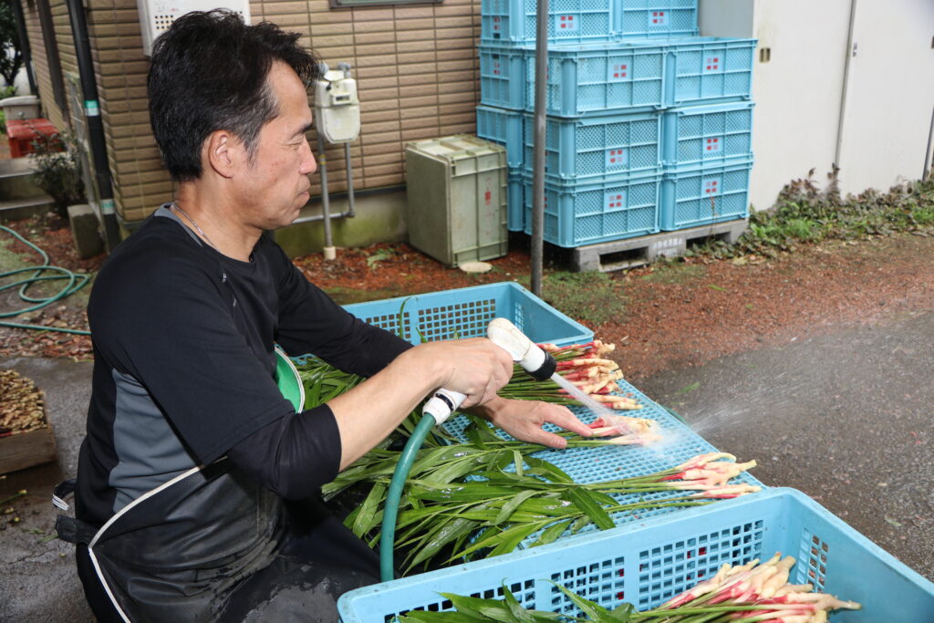 手作業で葉しょうがをひとつひとつ丁寧に洗浄し、土を落として出荷します。