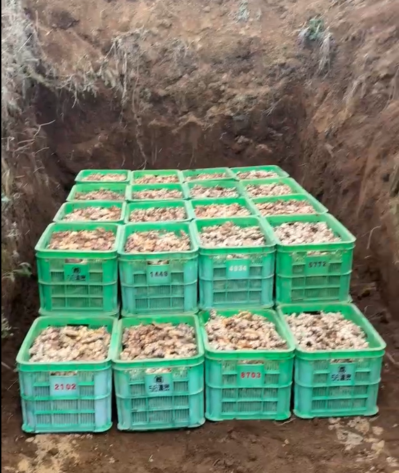 収穫された種しょうがは霜が降りる前、温度や湿度を一定に保つため、立っている人が埋まるほど深く掘った土の中に保存され、冬を越えます。